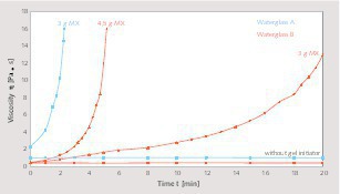 The added gel initiator salt MX is an anhydrous calcium sulfate (CaSO4) that initiates viscosity increases in the WG-QM mixtures that are comparable with those of triacetin (see Figure 1). Without salt addition, the viscosities of these mixtures remain demonstrably unchanged below 1 Pa s in the measurement period (20 min). By means of the added salt quantity (3 bis 4.5 g), waterglass WG B facilitates a useful setting of the beginning of the sol gel transition (optimization of potlives), whereas WG A gelatinizes too quickly.