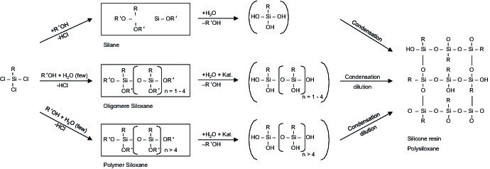 Silicones cover a broad physical spectrum of low viscosity oils, greases, rubbers and resins. The Rochow process is the most common technology for preparing organosilicones on an industrial scale. Starting point is the Rochow synthesis where alkylchlorides react with silicon in the presence of copper catalysts to alkylchlorosilanes. These silanes can be separated by distillation [1].