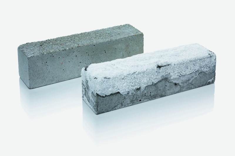 By adding silane/siloxanes to concrete or mortars the water uptake can be reduced by more than 90 % referred to the untreated reference. Admixtures based on silicones prevent primary efflorescence during the curing of the concrete. As a result fading of pigmented products can strongly be reduced or even eliminated. Furthermore, salt blooming which is known as secondary efflorescence is reduced as well [6, 7].