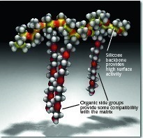 Therefore, most of the physico-chemical and application properties of OMS are determined by the length of the siloxane backbone and the number and nature of the organic grafts. Whereas the silicone backbone provides the low surface tension (typical for silicones) which is required for the spreading coefficient to be positive, the organic grafts can be used to control the compatibility of the OMS with the matrix.