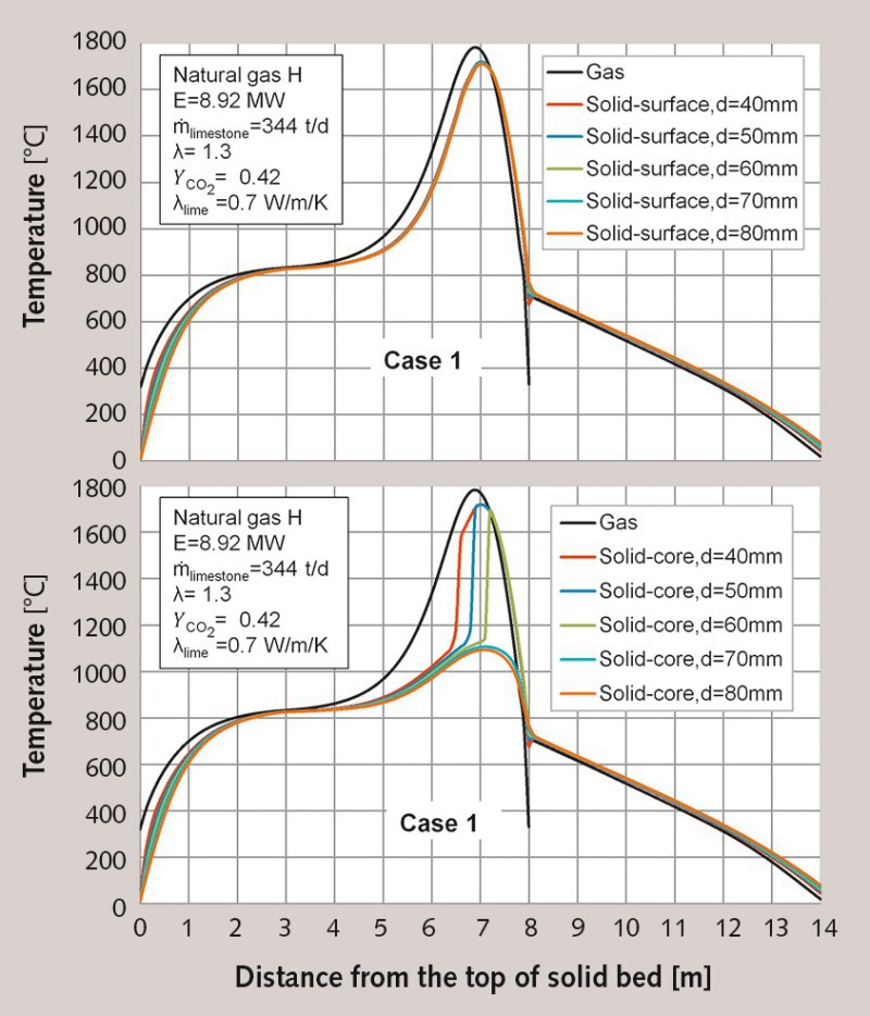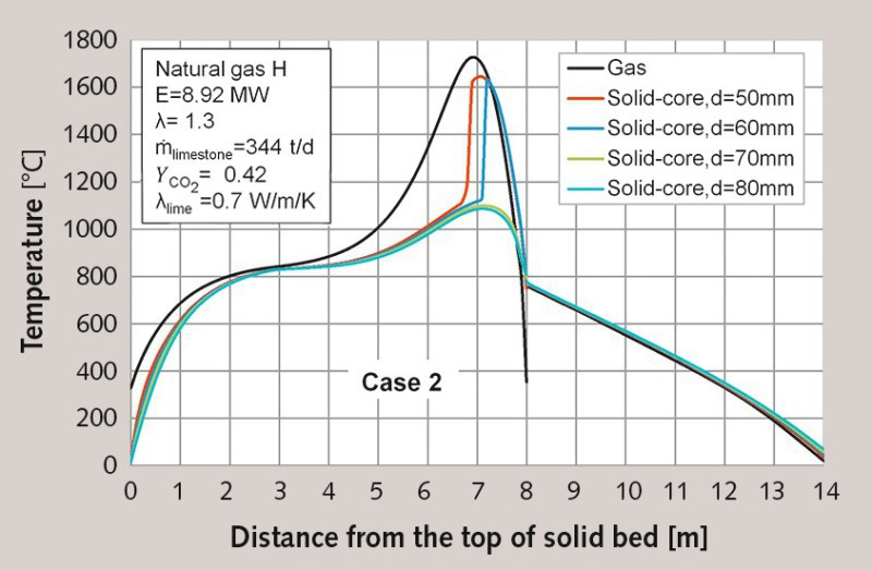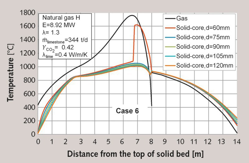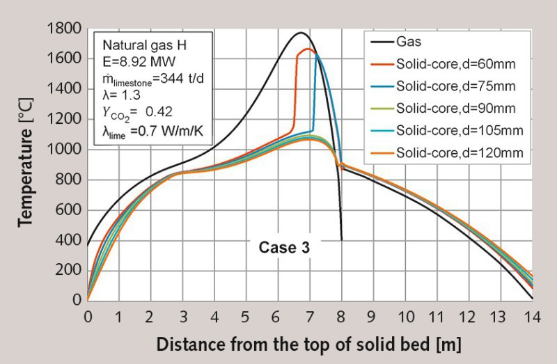 In the last case, the effect of the origin of the limestone was investigated. The crucial parameter in this case is the thermal conductivity of the quick lime. In Figure 5 the axial profiles of the core temperature and the gas temperature for the 60/120 distribution are presented. Here, the quick lime has a relatively low thermal conductivity of 0.4 W/m/K. From Table 7 and Table 2 it is clear that only the smallest class of 60 mm fully decomposed. The total residual CO2-content increased to a high value of 9.93 %. The temperature level degraded substantially, so that a high temperature difference is required for heat transfer. In order to reduce the residual CO2-content, the energy input must be increased or the stone throughput must be decreased.