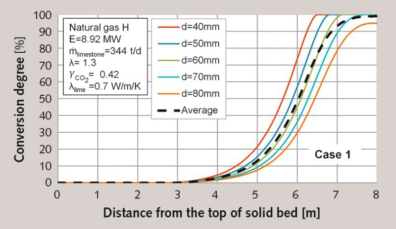 In the following, the effect of particle size distribution will be discussed. In Tables 5 and 2, the characteristic data from the fourth case is presented, in which the distribution (75 to 120 mm) is tighter. By analogy to the second case, the smallest class (here 60 mm) was removed. The residual CO2-content increased to 6.99 % and the maximum temperature was lower by around 100 K.