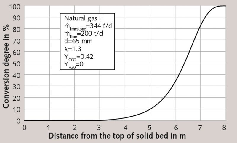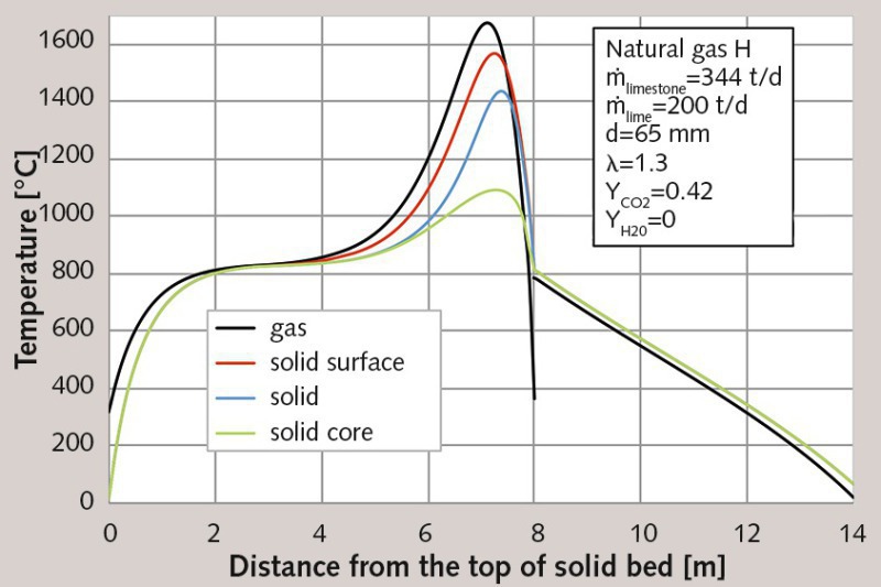 The potential results of simulation are explained below by way of example. The kiln has a diameter of 2.5 m and a total solid-bed height of 14 m, including a 6-meter cooling zone. Its limestone throughput amounts to 344 t/d. The limestone is presumed dry. It should be noted that the moisture content of the limestone has no effect on the in-kiln process, but only lowers the exhaust-gas temperature at the top end of the kiln. The mean particle size is assumed to be 65 mm. The limestone contains 42 % CO2 (weight loss). The injected fuel is natural gas with a net calorific value of 37.4 MJ/Nm³. The volume flow of fuel stands at 860 Nm3/h, yielding a burner output of 8.92 MW. In addition, an excess air number of 1.3 is assumed, so the volume flow of air figures to 11100 Nm3/h.