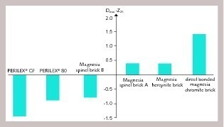 Applying the established AF technology and using sintered magnesia containing iron oxide (known from PERILEX® 80) with pleonastic fused spinel – a synthetic raw material – it was possible to manufacture the thermomechanically insensitive PERILEX® CF brick, which exhibits extraordinary physical properties and outstanding thermal shock resistance. Compared with the exceptional performance properties of a PERILEX® 80 brick, it was possible to increase mechanical strength by 20 % whilst maintaining the well-proven refractoriness (Fig. 6).