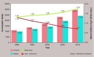 For example, the specific consumption of basic refractories dropped from 1.2 kg/t clinker in 1970 to its present value of 0.72 kg/t clinker (Fig. 1). Apart from the increased use of alternative fuels and raw...