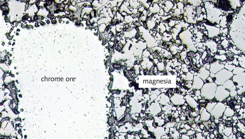 Contrary to this, the new PERILEX® 80 at that time was based on a European sintered magnesia, which exhibits a particularly elastic direct bridging bond between the chrome ore and the magnesia matrix thanks to an ingenious firing technique and the use of specially selected chrome ores (Fig. 2).