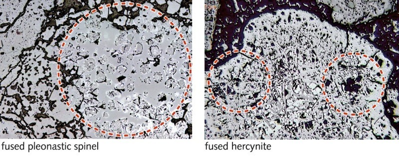 Due to diffusion of MgO and iron oxides, (MgO-free) hercynite is able to interact with its surrounding matrix [7], resulting in local porosities and microstructural inhomogeneities, which reduce the resistance of hercynite to cement clinker melt attack. Contrarily, such active reactions do not occur with MgO containing pleonastic spinel, so that a high level of corrosion resistance is given. Hereby, pleonastic spinel behaves similarly to magnesium-aluminium spinel, which also does not interact significantly with its surroundings.