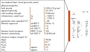Based on new developments in raw materials [5] [6], the concept of using a pleonastic spinel as an elastifier could also be applied to a product based on an iron rich raw material. In its composition, pleonastic spinel, i.e. a spinel from the MgO-Al2O3-FeOx system, is closer related to a chrome ore than e.g. magnesium-aluminium spinel (Table 1). The chromium oxide of the ore is replaced by the oxides Al2O3 and MgO, and also by Fe2O3/FeO to a lesser extent.