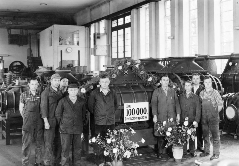 During the war Allstaedt’s son-in-law Karlheinrich Heller took over the management of the company and started the development of the first screw compressors. Their success on the booming European postwar markets was not long in coming. The factory was extended and supplemented by a second factory in Hamelin. In 1960, Karlheinrich Heller suddenly died, shortly before Aerzen supplied the 100 000th positive displacement blower (Fig. 8). The company had more than 600 employees at that time. In 1965, Hasso Heller took over the management of the company and started to develop it to a global player. In rapid succession he establishes subsidiary companies in France, England, USA and South Africa. At the same time the location Aerzen is modernised further, the range of products is expanded by many innovations. In 1978 Aerzen launches the world’s largest positive displacement blower on the market. It is used in the steel industry and has a piston diameter of 1.5 metres.