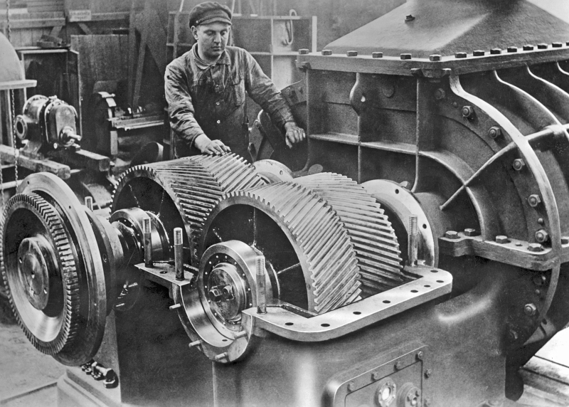 The essential step on the way to the special manufacturer for rotary piston machines made the company only in 1930 – after a landmark decision of the legendary company manager and engineer Hermann Allstaedt. He seeked and found a specialisation strategy for his company as way out of the world economic crisis. The willingness of Hermann Allstaedt to meet special customer requests shows the invention of the impellers or guide wheels for turbo machines in 1910 and the entry in the production of turbo blowers in 1911 (Fig. 6). In 1930, the growing gas pipeline business opened up a huge market for Aerzener Maschinenfabrik in the field of industrial gas measurement. Very soon it proved that the management had made the right decision with the rotary piston gas meters whose functional principle derived from the blower technology. Major customers like Ruhrgas AG or Friedrich Krupp AG secured the sales and were the basis for the user-oriented development of new machines for the compression of gases – still today one of the pillars for the company’s success (Fig. 7).