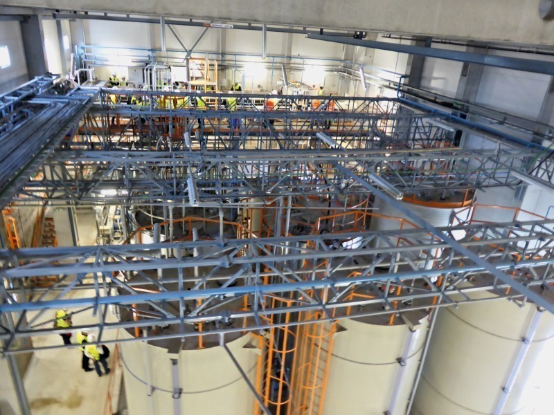 The tour included the bypass-dust treatment plant, which is designed to handle 20 000 t/a of bypass dust, with salt production of 4000 t/a. The process is designed for 5 to 15 % Cl in the bypass dust, with an overall Cl extraction efficiency of >90 %, and the facility for integration into existing cement-production processes (2x12 h shifts). The heat needed for crystallisation is supplied via recovery of waste-heat from the kiln. This process can be implemented in modular stages (1+2, 3 and 4):