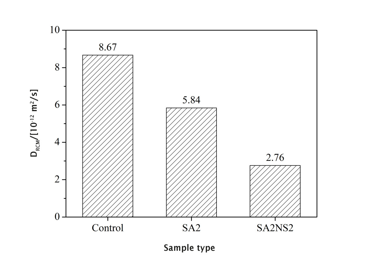 The influence of SA and SA-NS on the chloride diffusion coefficient of mortars is shown in Figure 5. This shows that the control sample has the largest chloride ion diffusion coefficient at 28 d and the addition of SA or SA-NS significantly reduced the diffusion coefficient. The chloride diffusion coefficient of the SA2 sample fell by 32.6% compared with that of the control sample. This indicates that incorporation of the polymer can significantly hinder the diffusion of chloride ions, which is consistent with the results of Liu et al. [11]. This is mainly because the capillary pore plugging effect of the polymer film and polymer particles can block the interlinking of the capillary pores and improve the pore structure of the hardened cement paste [11-13]. Moreover, the addition of 2% NS further reduced the chloride diffusion coefficient, which was 68.2% lower than that of the control sample, indicating that the sample mixed with SA-NS had a good resistance to chloride penetration.