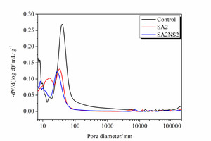 As can be seen from Figure 6a, the addition of 2% SA can reduce the most probable pore (MPA) of the sample from about 300 nm to 50 nm, which indicates that SA has a significant role in refining the pore size. Table 3 (3 d sample) shows that there was a sharp decrease in the pores with a size greater than 50 nm while there was a remarkable increase in the pores smaller than 50 nm when SA was added, which demonstrates that SA can make the pores change from harmful pores and more harmful pores to harmless pores and less harmful pores with the obvious effect of refining the pore structure. There is a slight in increase in MPA and in the total pore volume if NS is also added but there is a distinct decrease in pores larger than 20 nm and a slight increase in pores smaller than 20 nm, which means that NS with a particle size about 20 nm has a significant role in refining the pore structure.