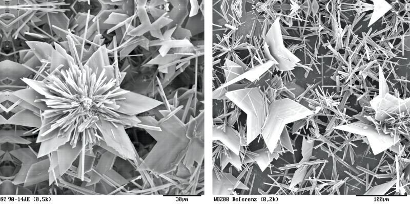 Figure 7 illustrates the growth of the needle-shaped and laminar dihydrate crystals. The large, rounded, particles are hemihydrate particles. The use of 0.2 % Melcret or Melflux plus caused no significant changes to the time until the first dihydrate crystals became visible. Only with the addition of Melflux was this time extended slightly but the crystals that were formed grew only minimally more slowly than with the reference sample. Only above a concentration of 0.5 % Melcret were the crystals visibly slightly delayed but the crystal growth (increase in crystal size) still seemed to be unaffected. At concentrations of 0.5 % Melflux and Melflux plus led both to an extension of the time until the first crystals become visible and to retardation of further crystal growth. Melflux retards the reaction somewhat more strongly than Melflux plus. Figure 7 shows an example of this behaviour in light-optical photomicrographs by comparing the reference sample with 0.5 % Melflux and 0.5 % Melflux plus. The sizes of the crystals present are roughly comparable in the images on the left. The images on the right show the samples five minutes later. It can be seen that the dihydrate crystals in the reference sample have grown significantly more strongly than those in the sample containing the PCE. The Melflux plus superplasticizer caused significantly less retardation. Figure 7 also shows the presence of very small particles in the samples containing superplasticizer. The trials undoubtedly confirm that the crystal growth of the dihydrate crystals is reduced by the presence of superplasticizers. The light-optical photomicrographs support the retarding action sequence already explained: Melcret < Melflux plus < Melflux.