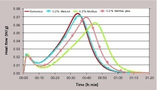 Up to a concentration of 0.1 % none of the superplasticizers caused significant retardation of the observed crystal growth. Differences appeared in the area of the very fine particles at an addition level of 0.2 % relative to the hemihydrate plaster. With the use of Melflux and Melflux plus there were many very fine particles present at the start of the reaction and they dissolved again during the course of the reaction. These could be the first small dihydrate crystals the growth of which was obstructed by the adsorption of superplasticizer and which then dissolved again later as a result of Ostwald ripening. A second possible explanation of these fine particles is the dispersive action of the superplasticizer. Very small particles in the reference sample can agglomerate, i.e. form larger accumulations of particles, without any obstruction but the addition of superplasticizers obstructs the formation of such accumulations of particles. It is therefore possible that the dispersion of the very fine particles leads to an apparently finer particle size distribution.