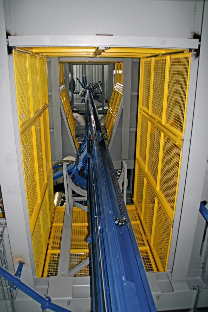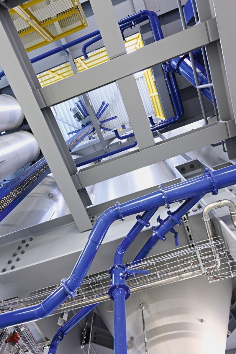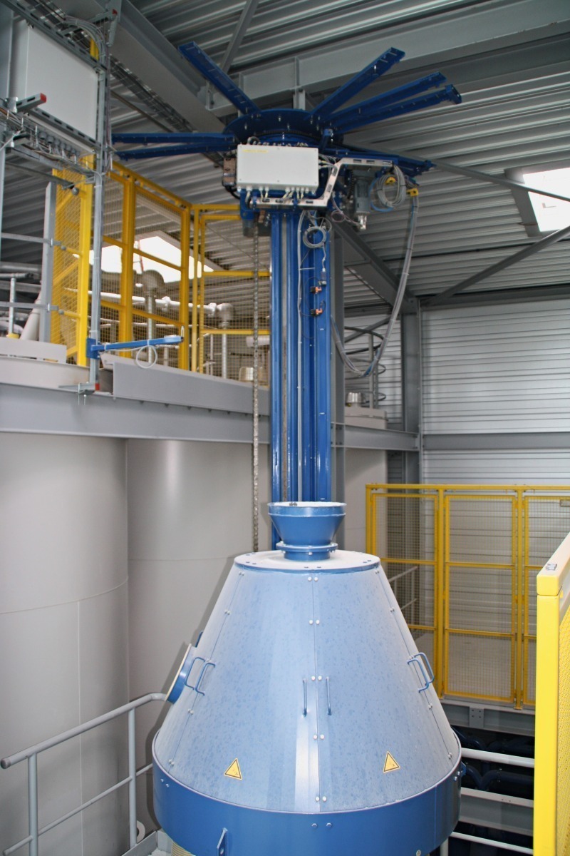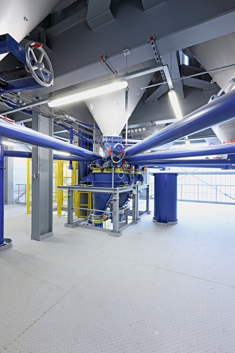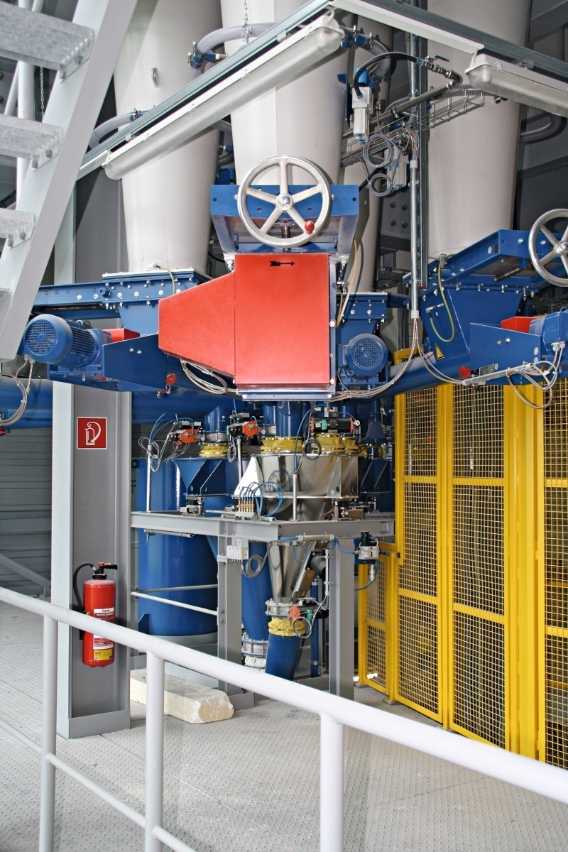 Further raw materials, such as limestone meal and aluminium oxide, are delivered by truck in big bags and stored in these bags. The big bags are taken out of storage as necessary and lifted by electric chain hoist to a discharge station at platform level “+4.25 m”, from where the contents are tipped into four additive silos with a capacity of 3 m3 each. Before the big bags are emptied, the plant operator selects the respective silo via an operator panel at the discharge station. The material is then emptied into an intermediate silo. The quicklift then transports the raw materials to platform level “+20.1 m” (Figs. 4 and 5). From that platform the material is distributed by an automatic rotary diverter valve to the previously selected additive silo.
