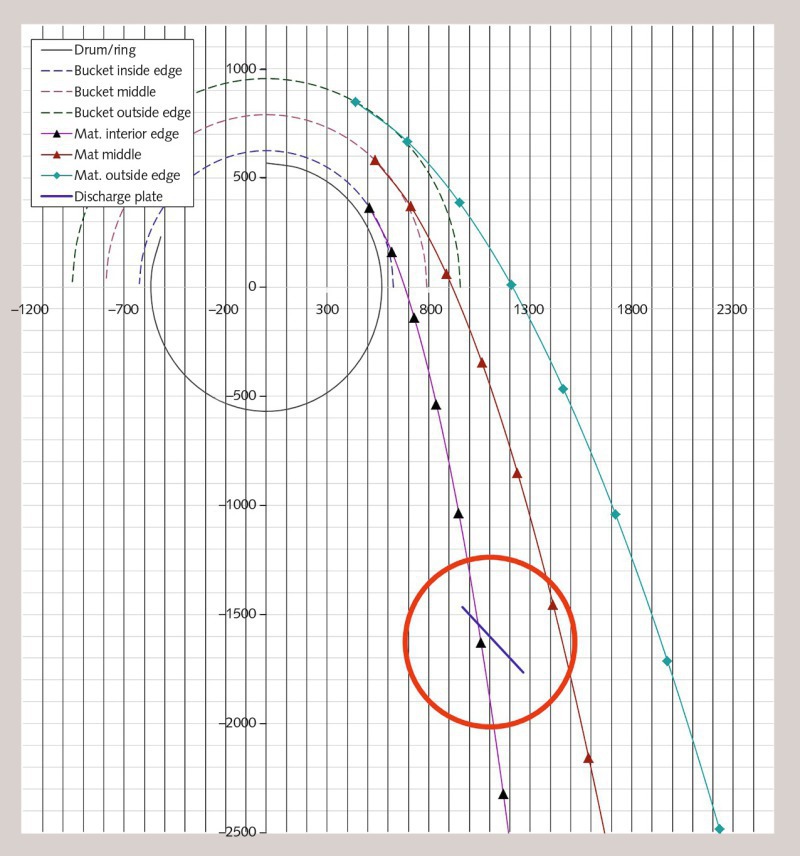 If and how far the capacity of a machine can be increased, has to be determined in each individual case. Experience shows that for example the conversion of a round link chain bucket elevator into an Aumund chain bucket elevator with central chain (Fig. 1, 2) will result in a doubling of performance. As the case may be adapting the material feed and material discharge might become necessary in this context. To achieve an optimum discharge process with a bucket elevator, the process is analyzed by means of a digitally calculated discharge parabola (Fig. 3). Adaptions of the material discharge based on the analysis of the discharge parabola optimize the discharge of the material into the discharge area (Fig. 4).