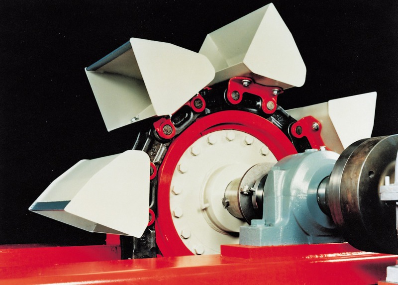Conversion Level I: the traction mechanism like chain or belt will be replaced. Usually these are central chain bucket elevators (BWZ), belt bucket elevators (BWG) or deep drawn pan conveyors (KZB, Fig. 5). The buckets of the bucket elevators, the drums or the drive train are re-used unchanged. Just a minimum of new replacement parts will be inserted into the machine.