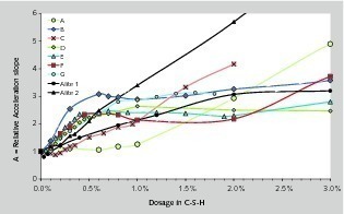 Basically, 4 types of accelerating behaviors can be identified. (1) A small addition rapidly reduces the “dormant period”, then the acceleration increases until reaching a plateau (cement D); (2) The hydration is further accelerated with a higher dosage of C-S-H (cement F); (3) sometimes the dormant period is not completely suppressed (cement E); and (4) finally the hydration of pure alite shows an immediate increase of the acceleration, still combined with a long dormant period. The evolutions of relative acceleration A for all cements are shown in Figure 4.