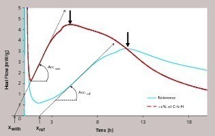 A linear heat flow evolution occurs during the first hours of hydration (Fig. 1). As the heat flow is proportional to the hydration rate of silicate phases, the derivate of heat flow with respect to time represents the hydration acceleration. The linearity means that the acceleration is constant, and defined by the slope Acc.ref for reference, and by Acc.with CSH when seeds are present. The relative acceleration A, due to the addition of C-S-H seeds, is calculated as follows: