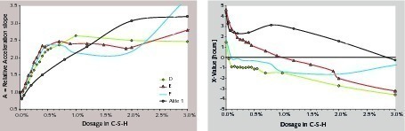 All cements and alites were hydrated with various amounts of C-S-H up to 4%. In Figure 2 4 examples of the principal behaviors encountered in our experimental set are shown. Then, the relative accelerations A and X-Values are reported in Figure 3 for the same cements and alite.