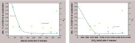 We may define a reference state, indexed with 0, and an accelerated state indexed with 1. At low changes in ion concentrations, there is equivalence between the volume evolution and the surface evolution. Therefore, there is an acceleration of the hydration if and only if: