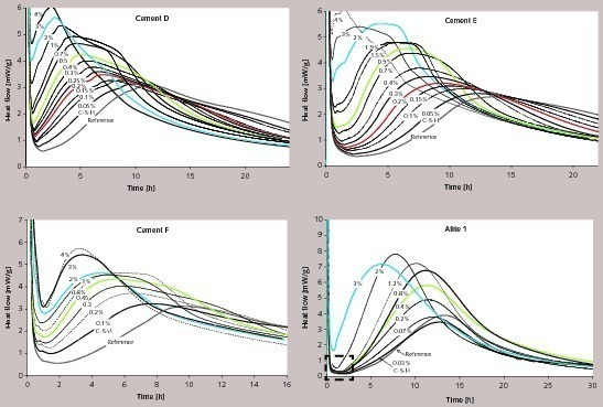 It is remarkable that for all cements, the sulfate depletion characterized by a peak in the respective calorimetric curves (see Fig. 1) is also accelerated. This can be reasonably explained by the fact that the presence of C-S-H seeds accelerates the dissolution of C3S and therefore the flow of calcium and hydroxide ions which in turn contribute also to the acceleration of the aluminate hydration.