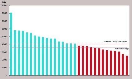 The average daily production scale for the new dry process production lines of 57 enterprises and enterprise groups with a production scale of more than 5 million tons is 4024 tons, higher than the average daily production scale of 3575 tons for national new dry process production lines. The difference in the daily production scales for the new dry process production lines in large enterprise groups is very obvious. In the former 30 enterprises and enterprise groups, Hainan Huasheng and Yadong both have production lines with a daily production of 4000 tons or more and the average daily scale for the new dry process production lines of Hainan Huasheng, Tianrui, Taini, Yadong, Conch, Jiangsu Jinfeng and Henan Tongli surpasses 5,000 tons. Meanwhile, there are also 9 enterprise groups with production line capacity of a daily production of 4,000 tons or more and 13 enterprises and enterprise groups with an average daily production scale for the new dry process production lines of less than 4000 tons (Fig. 19 and Fig. 20). The difference in average daily production scale for the production lines reflects the difference in aspects of the technical economical index such as unit products’ consumption and labor productivity among large enterprise groups. This attributes to the difference in unit products’ costs among large enterprise groups and highlights those enterprises that are competitively strong and those that are competitively weak.