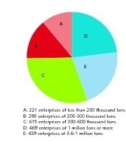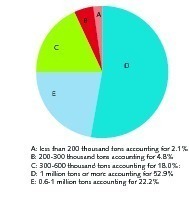 By November 2013, there were 2034 cement grinding enterprises with a cement capacity of 1.34 billion tons, accounting for 41.1 % of the total cement capacity. This includes 469 cement grinding enterprises with a yearly production scale of over 1 million tons and productivity accounting for 52.9 % of the grinding enterprises capacity; 439 enterprises of 0.6-1 million tons with capacity accounting for 22.2 %. The grinding enterprises with a capacity of more than 0.6 million tons account for 75.1 % and the 1126 enterprises of less than 0.6 million tons account for more than half of all grinding enterprises, but their capacity accounts for only 24.1 % of the total (Fig. 15 and Fig. 16).