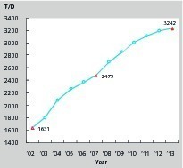The development of a new dry process production line boosts the expansion of the production scale of domestic cement enterprises. At the end of 2002, among the 238 operational new dry process production lines, there were only 18 production lines with a daily production of 4,000 tons or more each, and the capacity accounted for only 21.2 % of new dry process clinker capacity (Fig. 11). The average daily production scale of the 238 production lines was only 1,631 tons (Fig. 14). After 2008, the daily production scales of the newly constructed new dry process production lines were all above 3,000 tons and the domestic new dry process production line of cement tended to be large (Fig. 13). By November 2013, among the 1562 new dry process production lines in operation, 637 were production lines with a daily production of 4,000 tons or more. That capacity accounted for 60.6 % of new dry process clinker capacity (Fig. 12). The average daily production scale of new dry process production lines increases to 3,242 tons (Fig. 14).