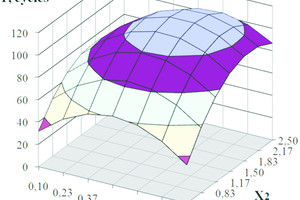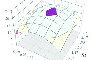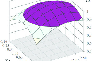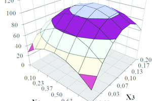 R = –8.74 + 41.38X1 + 14.45X2 + 143.85X3 – 0.32X1X2 + 6.67X1X3 – 9.21X2X3 – 40.195X21 – 4.29X22 –655.43X23 ⇥(1)