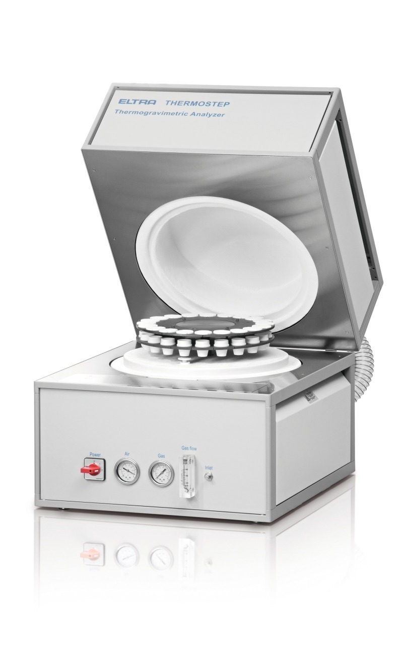 Eltra’s TGA Thermostep is a thermogravimetric analyzer which determines various parameters such as moisture, volatiles and ash content in one analysis. The user defines the temperature profiles and atmospheres according to his requirements. The device analyzes up to 19 samples with a maximum weight of 5 g each, reaching temperatures of up to 1000 °C. To determine volatile components in a sample reliably and in accordance with the ASTM standard, the crucible lids can be automatically placed and lifted during analysis following a user-defined program.