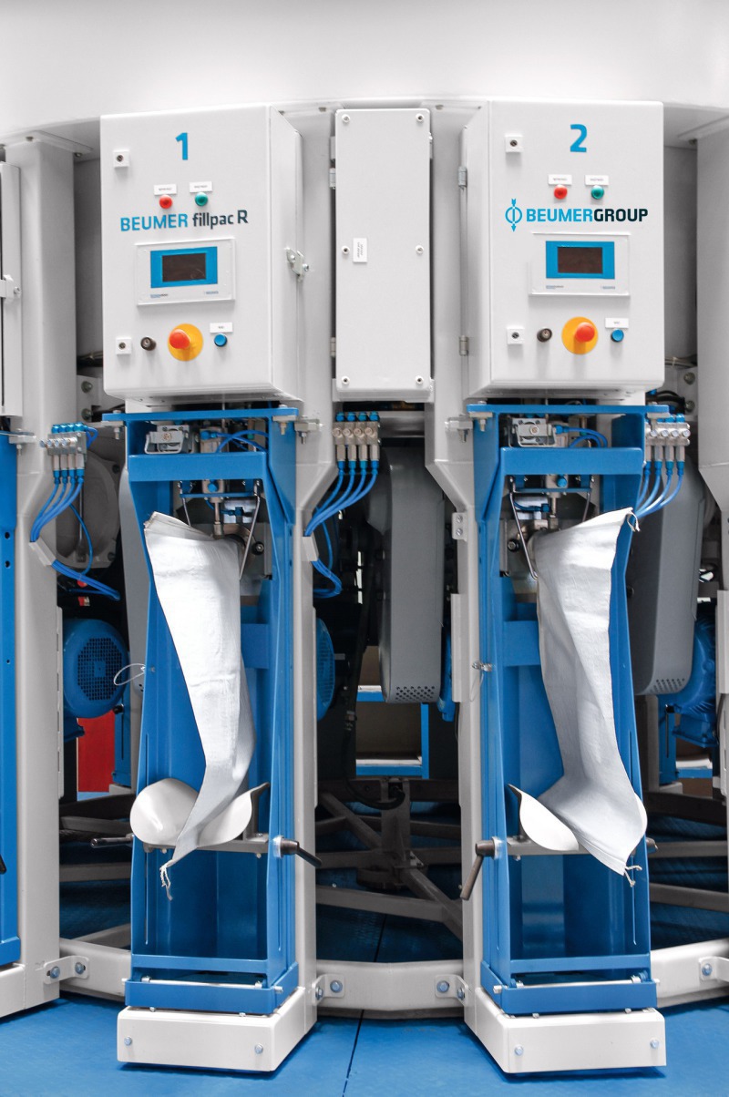First, the bulk material needs to be filled in bags so that it can be palletised, packaged and sent to the customer. As a single-source provider, Beumer Group offers an innovative solution with the fillpac filling machine and provides equipment and systems for packaging lines. The new machine can be flexibly integrated with existing packaging lines and can be optimally adapted to the customer’s situation. What makes the Beumer fillpac unique are the specific weighing electronics which ensure the weight accuracy of the bags. Rejects caused by too high or too low filling weights can almost be eliminated. The weighing unit communicates permanently with the filler neck via a specific software. The automatic bag weight adjustment determines the exact filling weight of the bags, thus enabling the exact degrees of filling during the filling process. The filling spout is equipped with a special hood that reduces dust emission to a minimum. There are also suction points on both sides in the area of the filling spout. The dust is sucked off directly where it builds up and fed back into the process. This allows for a practically dust-free filling of the bags. The three-position cylinder that regulates the coarse and fine flow is protected from dust, because it is positioned vertically and outside of the dirty area. The cylinder for bag discharging is also located in the dust-free zone above the filling spout.
