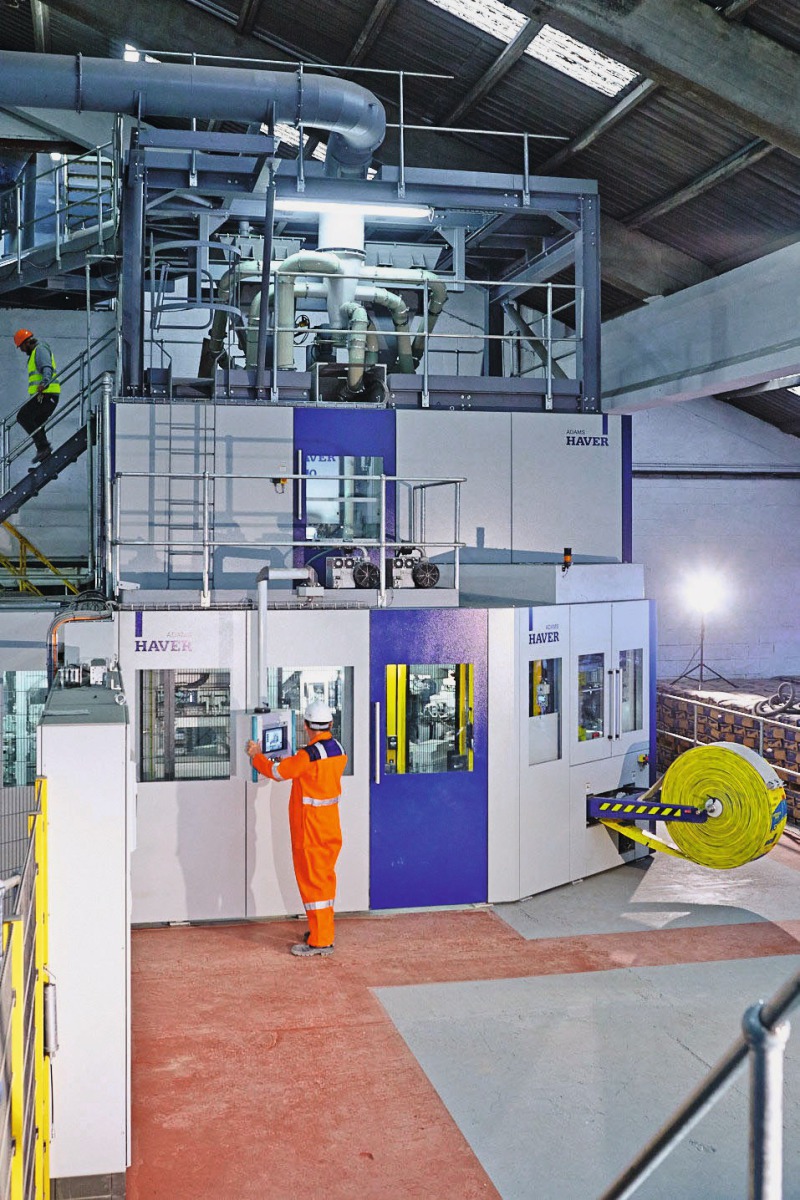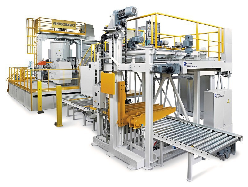 With the acquisitions of EEL by FLSmidth, Enexco by Beumer and Newtec by Haver & Boecker, the leading suppliers in the sector have been able to improve their market position and scope of supply [5]. Packer capacities have increased considerably from 4 to 12 and 16 rotating filling spouts (Fig. 14). Seal technologies and packing into plastic bags (PE) are widely increasing due to environmental aspects and a number of other advantages. Palletizers (Fig. 15) also have to cope with larger capacities. However, there is not just a trend to bigger and cleaner. With the focus on cost optimization Ventomatic have very successfully introduced the Ventocompact concept (Fig. 16) to the market. The Ventocompact is a complete production line composed of a rotary packer with supporting structure, automatic bag applicator, bag treating and sorting unit with electronic check weigher as well as a palletizer. The concept allows capacities up to 3000 bags/h.