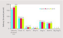 Increasing the cement dispatch network follows trend [1]. Other major trends are illustrated in Figure 2, which gives an indication of how cement transport distances have changed in the last few years as well as how the mode of transportation has changed. Although in the last 15 years more cement plants have become operational and the global cement plant density has increased, the average cement transport distance has increased from 160 km to about 190 km. The share of cement distributed by trucks has decreased from 86 % to 82 %, while the share of rail and ship transports slightly increased. Here it has to be noted that rail and ship transports are only used for the primary transportation from the cement plant to the cement terminals, while truck transports are used for both, the primary and secondary transportation to the depots and final customers. Furthermore, the share of bagged cement declined by 5 %, while bulk cement gained a 4 % market share and big bags gained a 1 % market share.