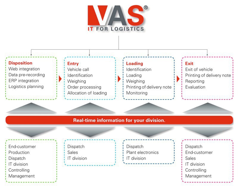 Cement dispatch automation solutions are offered beside the major equipment suppliers by large process automation suppliers such as ABB, Siemens and Rockwell Automation as well as specialist companies. In many cases automation processes have been adapted from other industries. The product family VAS by Fritz & Macziol is one of the market leaders in logistics and dispatch automation systems. More than 160 systems have been delivered to the cement industry so far, including major producers such as Lafarge, Holcim, HeidelbergCement and Cemex. The Java-based application software spans the entire process chain from delivery to dispatch, loading and delivery [6]. As a link between ERP systems and technical systems, VAS represents a key function for efficient process sequences (Fig. 20). In addition, the system supports reporting functions and supplies real-time information to other systems, for example for production, sales or controlling. All external technical systems such as the weighing, silo extraction or metering technology are completely integrated into the process.