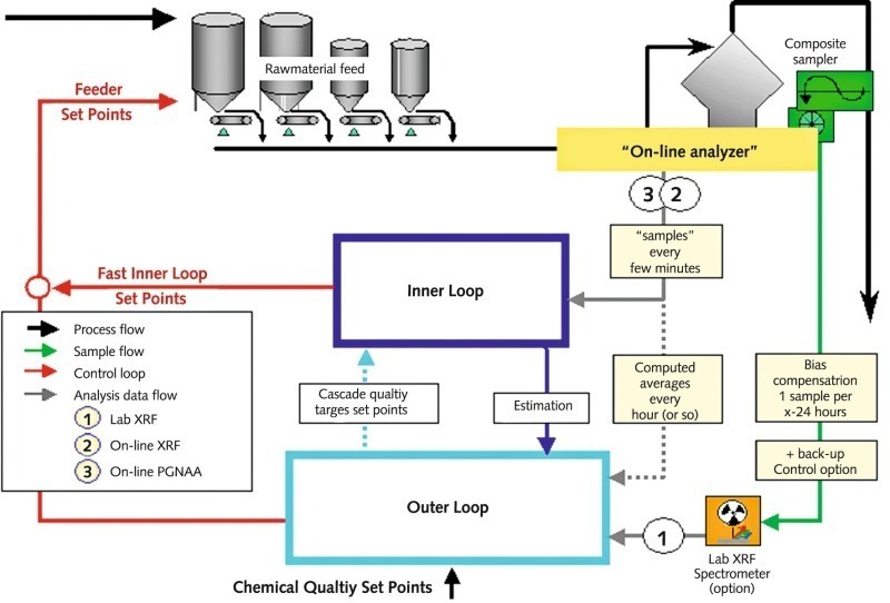 The best means of achieving process optimization is generally a combination of online and inline analysis with two control loops. As depicted in Figure 10, for the raw meal analysis the inner control loop is formed by an online analysis and the belt feed material is used as the manipulated variable. The outer control loop consists of inline laboratory analysis. Such a configuration can be used for the implementation of various cascade solutions, which can also include the raw meal blending silo to achieve an optimal raw meal consistency. However, such methods also involve a significant increase in the amount of equipment and the complexity of the control system.
