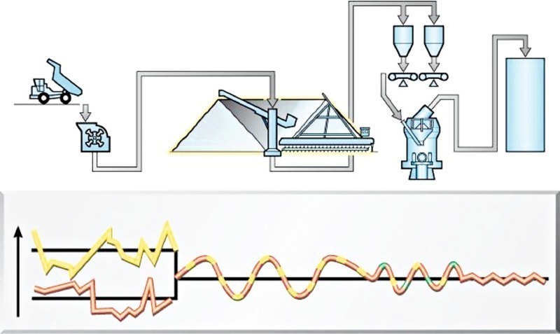 Figure 8 illustrates the complexity of the raw material variation. The first step is to employ a blending bed to even out the quality fluctuations in raw materials coming from the quarry. Other components are added in the raw mill in order to attain the constant cement moduli for the burning process. Complete homogenization takes place in the raw meal blending silo.
