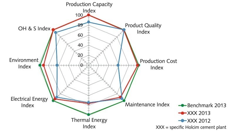 Figure 2 shows an example of the overall performance index of a cement plant, benchmarked against other plants [4]. The benchmark index is given as 100 for each parameter and includes aspects such as production capacity, product quality, thermal energy, electrical energy, production, maintenance costs and OH&S. While the rated production capacity of the kiln is mostly indexed at 100, the thermal energy consumption index can be 3.0 GJ/t of clinker and the electricity demand index can be 100 kWh/t of cement. More specifically the indexes can also be based on the best practices which are possible for a specific kiln size [5].