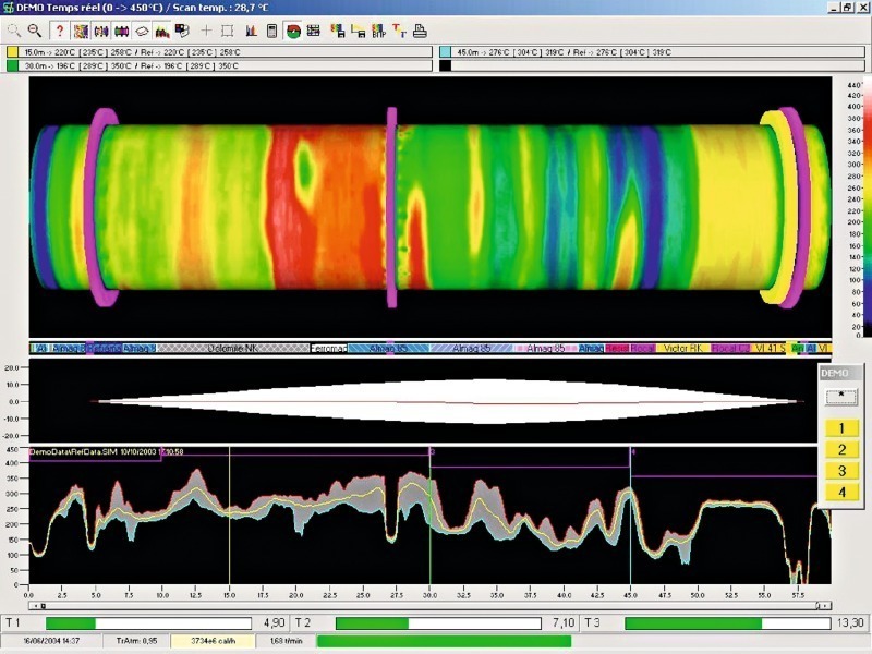 In recent years condition monitoring has experienced a real boom, due to the advance in automation solutions. Condition monitoring of plant components is supported by active maintenance concepts that are aimed at identifying fault mechanisms and consequential damage and determining the possible effects of, for example, operating errors or incorrect maintenance. One of the most widely established processes in the cement industry is computer-aided thermal imaging of rotary kilns. The latest processes make use of infrared sensors that scan the entire length of the kiln and supply three-dimensional pictures and evaluations (Fig. 13).