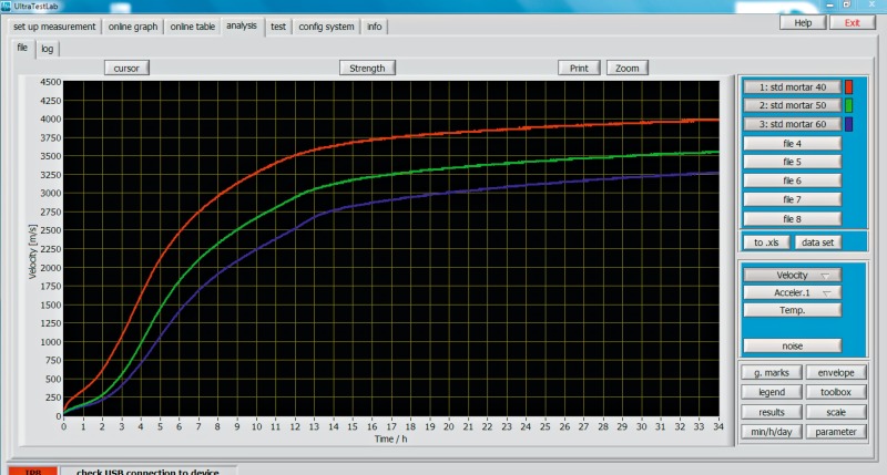 Figure 1 displays three setting curves of standard mortar. 50 % H2O is the standard mixing ratio. From the screen, it is easily visible that 40 % H2O result in a better consistency, but is difficult to handle. 60 % H2O lead to a significantly lower final strength of the mortar. In order to understand critical situations, the user can easily add further curves, e.g. derived signal curves or the temperature of the material under test. Figure 2 shows an IP-8 system with 6 (of 8 possible) channels connected.