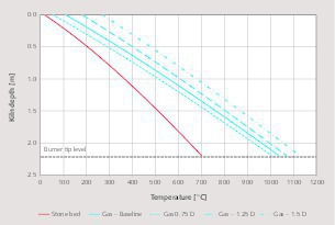 As explained earlier, the increase of the stone size reduces the stone surface in contact with the gas. This is why the heat exchange is less efficient when the stone size increases and therefore why the kiln flue gas temperature is higher (poorer heat recovery capacity of the kiln). At the same time, higher energy is necessary to ensure the heat exchange along the preheating zone. This is why the gas temperature at the burner tip level increases with the stone size.