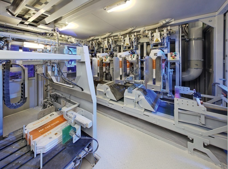 In April 2009, the company integrated a further modern plant for the production of gypsum plaster at their works no. 1. The upgrading consists of a 4-spout packer, type Integra 4S, from Haver & Boecker, Oelde/Germany (Fig. 2). This is the first machine of this type that is equipped with four filling spouts. This is a fully automatic machine including a silo for empty bags and an automatic bag applicator with a capacity of approx. 800 bags/h. It is equipped with an ultrasonic valve-sealing device. The capacity mentioned is related to 30-kg bags and will be correspondingly higher with smaller filling amounts. From now on it will be possible to handle bags with weights from 10 to 30 kg. The specified bag weights are checked by means of a calibrated continuous weighing machine with a particularly narrow tolerance range. If the weight falls below a certain limit, the bags are automatically removed. The bagging machine is completely enclosed and in this way is protected against dust and environmental impacts. It can be completely controlled from the outside. The bagged gypsum and gypsum plaster products are of the brand MultiGips.
