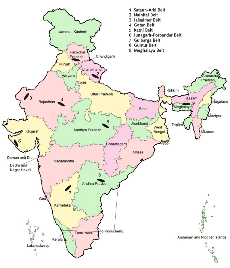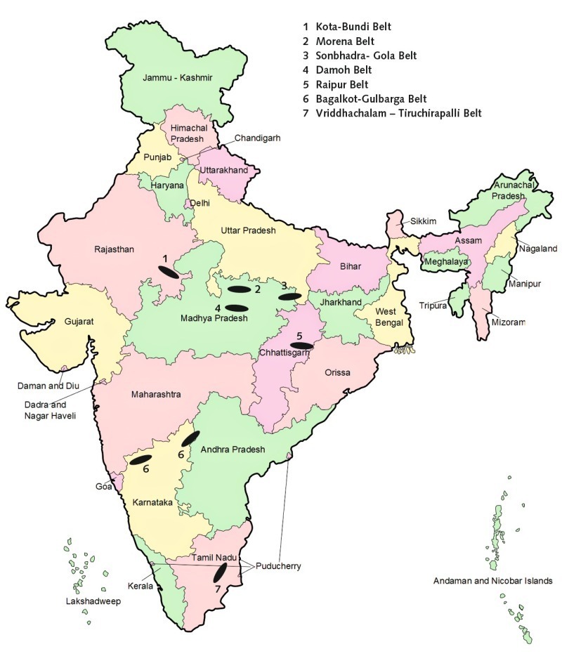 Many marginal grade deposits are found which are not useable directly in clinker manufacturing. Such low/marginal grade limestone deposits occur along with cement and other grade limestone in the Kaladgi and Bhima basin of Karnataka, Narji limestone of Andhra Pradesh, and Vindhyan limestone of Madhya Pradesh, Rajasthan, Uttar Pradesh and Jharkhand, Chhattisgarh Super Group in Chhattisgarh and Kallankurichchi & Niniyur limestone of Tamil Nadu. The occurrence of prominent marginal grade limestone in India is shown in Figure 3.