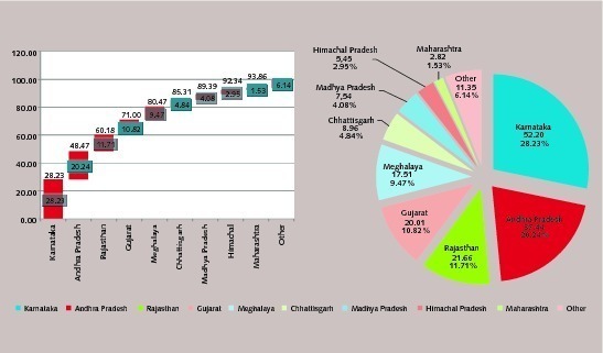 Though limestone deposits occur in 24 Indian states and 2 UTs, 48 % of the total limestone resources are concentrated in Karnataka and Andhra Pradesh only. Another 32 % are concentrated in Rajasthan, Gujarat and Meghalaya. Hence, 80 % is concentrated in five states only. The state-wise distribution of limestone in India is given in Figure 2.