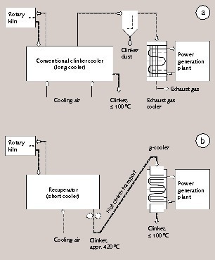 Claudius Peters Projects GmbH analyzed the usage of a recuperator/g-cooler combination for increasing the energy efficiency, protecting the environment and conserving resources in cement plants [1]. One of the main points of study was whether the existing process of clinker-heat extraction for use in a downstream power generating plant, involving a conventional waste heat exchanger/waste heat boiler, could also be realized directly in a g-cooler using a suitable heat transfer medium. Figure 1 compares these two variants: design (b) utilizes the thermal content of the clinker directly for heating up the heat transfer medium and thus permits the achievement of higher heat-transfer-medium outlet temperatures, i.e. delivers a higher-value heat flow. Moreover, the amount of required equipment appears to be lower than it is in design (a).