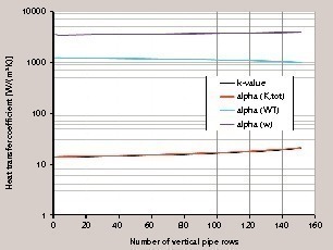 In Figure 5, the different heat transfer coefficients calculated for a given operating case are plotted from the bottom to the top along the height/pipe levels of a g-cooler [12]. The depicted operating case is the reference case with a heat transfer medium outlet temperature of tWT,out = 300 °C, a heat transfer oil selected to suit the given temperature range and pipes of type DN 100. It is known that the total heat transfer coefficient k is always smaller than the smallest of the individual heat transfer coefficients in equation (2). Here, the heat transfer at the bulk-material side described by αK,tot is lower by powers of ten than (αWT, αw), and is thus the limiting mechanism for the transportation of heat. The k-value is almost identical with αK,tot. For this reason, improvements in the heat transfer have to take place on the bulk-material side; in the case of a liquid heat transfer medium, the transfer-medium side has no influence. Comparable results were found in all the conducted calculations.