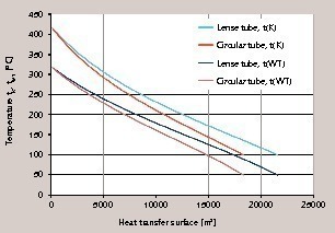 Despite the higher heat transfer coefficient kWT ~= 1.33 · kair, at temperatures above tWT,out ~= 200 °C the heat-transfer-oil cooling requires an increasingly larger heat transfer area AWT than that needed for the air cooling. This is due to the fact that in line with an increasing outlet temperature tWT,out there is a steady decrease in the driving temperature difference ∆tαν,WT between the heat transferring and heat absorbing material flows. Independent of the process involved, the downstream power generating plants require heat-transfer-oil temperatures of tWT,out ≥ 300 °C. To fulfil this requirement, the heat transfer area has to be increased to AWT ≥ 1.5 · Aair compared to the current standard g-cooler.