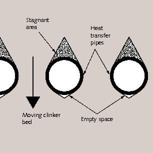 For calculation of the subsequent heat transportation through the bed of material, the bed is treated as a continuum with correspondingly defined effective characteristics. Details of this are provided in annex B. The contact time τK,w of the clinker bed and the cooled wall required by equation (B1) is calculated as contact time at the individual pipe, as the bed of bulk material can be regarded as thoroughly thermally mixed because of the alternate heat extraction due to the staggering of the individual rows of pipes. As a consequence, no steady-state temperature profile occurs. With the maximum downward-movement speed uK ~= 4.5 cm/min, the contact time calculated for the standard lens-shaped pipe is τK,w ~= 510 s. This decreases to τK,w ~= 210 s in the case of the DN 100 pipe.