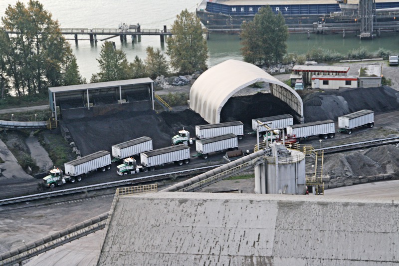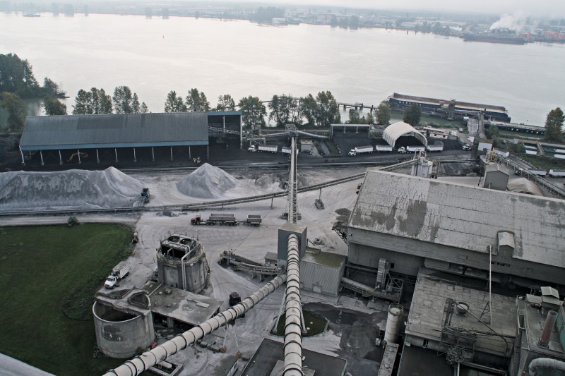 Most of the raw materials and fuels come in on the water, as the Richmond plant is situated directly on the Fraser River. Thus, the main portion of the limestone, gypsum, some silica sources, coal and petcoke arrive by barge. The rest of the material such as alternative fuels, shale and additional silica sources is delivered by truck.